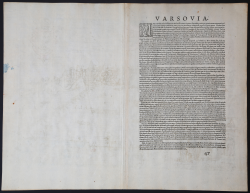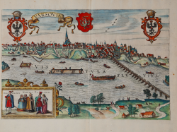 Perspective view od Warsaw; the city is shown from the east bank of the Vistula, with a view of bustling river traffic. The narrow bridge over the river was contructed in 1573. The plate in included in the sixth volume (1617) of the Civitates Orbis Terrarum, the first atlas devoted exclusively to plans and views of the world's major cities. Printed in six volumes between 1572 and 1617 it was so successful and widespread that several editions translated into Latin, German and French were printed.