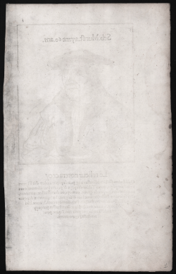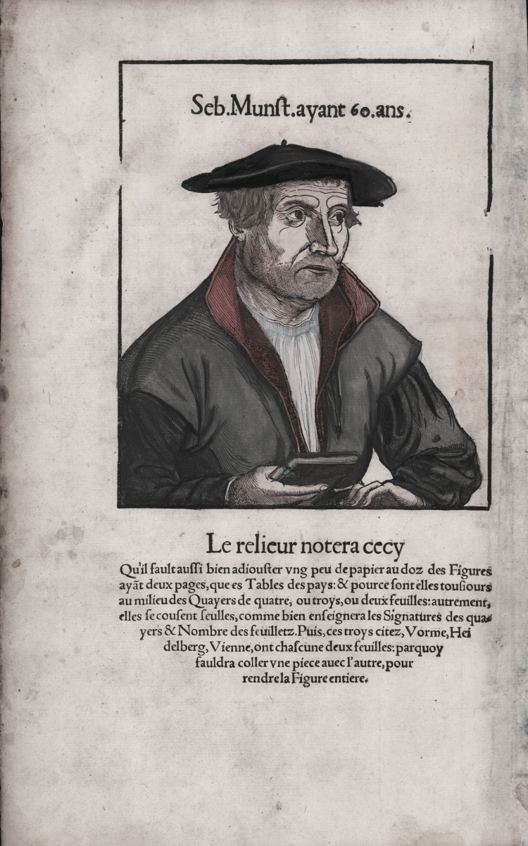 Portrait of Sebastian Münster, bust-length, facing right, wearing a doublet and beret, holding a book in his right hand; first published in Münster's "Cosmographiae universalis Lib. VI". Example from the French edition of 1552.