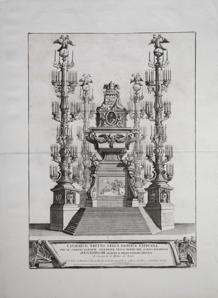 CATAFALCO ERETTO NELLA BASILICA VATICANA PER LE SOLENNI ESSEQUIE CELEBRATE NELLA MORTE DEL SOMMO PONTEFICE ALESSANDRO VIII, SEGUITA IL PRIMO FEBRARO MDCXCI. Architettura di Mattia De Rossi, dato in luce da Domenico De Rossi, herede di Gio. Giacomo de Rossi, in Roma alla Pace con privilegio del S.P.