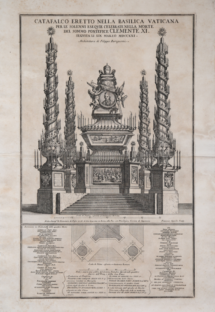 The engraving depicts the catafalque erected in the Vatican for the funeral of Pope Clement XI, born Giovanni Francesco Albani (1649-1721), celebrated on March 19, 1721. Filippo Barigioni was commissioned to build the catafalque in St. Peter's and later those of Innocent XIII (1724) and Clement XII (1740).