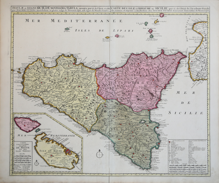 “La carta, come è chiaramente indicato nel titolo, è "inventa par G. de L'Isle, et edita par Joackim Ottens". Joachim Ottens (1663-1719) fu il fondatore dell'attività di commerciante in mappe e stampe ad Amsterdam, continuata dopo la sua morte dalla vedova e dai figli Reiner (1698-1750) e Joshua (1704-1765). La loro massima attività si registra tra gli anni 1719 e 1750; in un catalogo di vendita delle carte geografiche e marittime, realizzato in quel periodo, sono elencate 269 carte e la Sicilia vi compare al numero 73: "[Le Royaume] de Sicile & les Isles de Malte et de Gozo. Par L'Isle". La fama della loro produzione è dovuta alle gigantesche raccolte di mappe realizzate su commissione, che arrivarono a comprendere 15 volumi. Uno degli esemplari più belli, in sei volumi, è conservato nel Teyer Museum di Haarlem. Al titolo seguono i dati editoriali "edita par Joachim Ottens Amstelodami in platea vulgo de Nieuwen-dyk sub signo de Werelt-Caart." Lo stabilimento a Nieuwendijk fu acquistato da Joachim nel 1719, anno della sua morte, e la vedova (morta nel 1725) e i figli continuarono la sua attività con il nome "In de Wereltcaert" (la carta del mondo) ed è il motivo per il quale si ritiene che la carta della Sicilia sia stata redatta nel 1719. La carta è contenuta in una raccolta della Library of Congress le cui mappe sono datate tra il 1641 e il 1729.