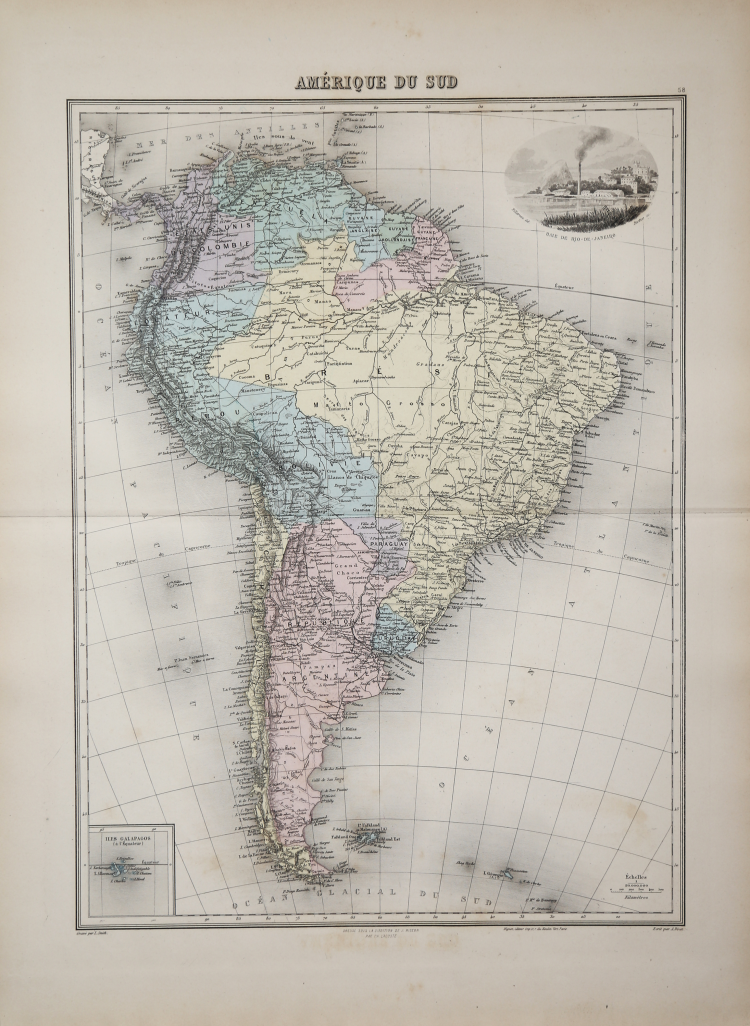 This French atlas is one of the most decorative atlases of the late 19th century. In addition to being hand colored, the majority of the maps feature one or more superb vignettes showcasing key cities or monuments from the region. The atlas contains 43 maps (41 of which are double-page), including one celestial chart, six historical maps, and 37 modern maps.