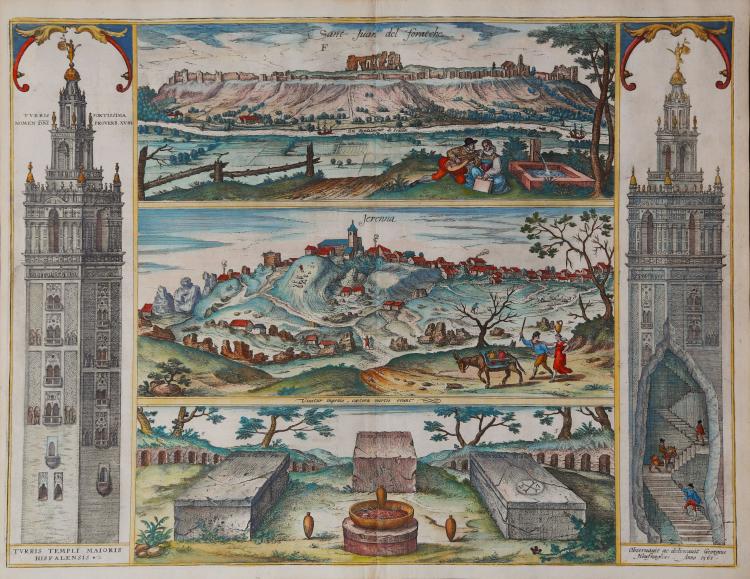 - Seville (Turris Templi Majoris Hispalensis): The centerpiece of the engraving is the prominent depiction of the Giralda, the bell tower of the Seville Cathedral. This structure is shown in great detail, emphasizing its architectural importance.