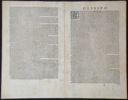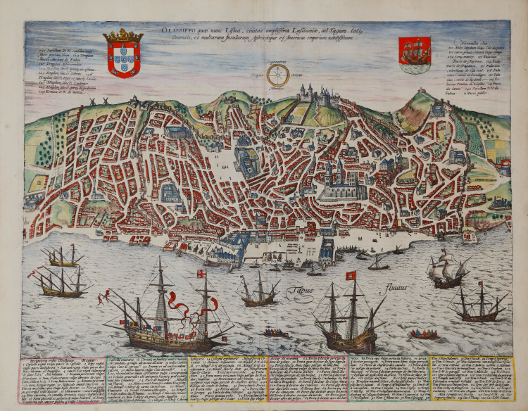 Bird’s-eye view plan of Lisbon (Lisboa) published in the fifth volume (1597) of the Civitates Orbis Terrarum the first atlas devoted exclusively to plans and views of the world's major cities. Printed in six volumes between 1572 and 1617 it was so successful and widespread that several editions translated into Latin, German and French were printed.