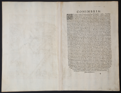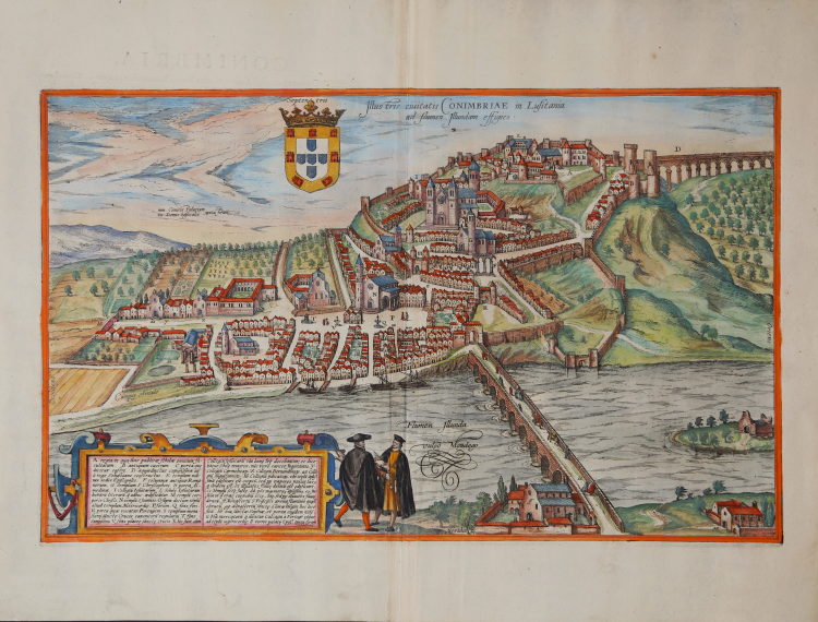 Bird-eye-view plan of Coimbra, published in the fifth volume (1597) of the Civitates Orbis Terrarum, the first atlas devoted exclusively to plans and views of the world's major cities. Printed in six volumes between 1572 and 1617 it was so successful and widespread that several editions translated into Latin, German and French were printed.