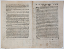Detailed bird-eye view of the Escorial, the historical residence of the King of Spain located in the town of San Lorenzo de El Escorial. The engraving captures the extensive layout of the complex, including the main building, gardens, and surrounding landscape. The illustration highlights the symmetry and grandeur of its design, which was intended to reflect the might and piety of the Spanish monarchy. First published in the sixth volume of Civitates Orbis Terrarum, edited in 1617.