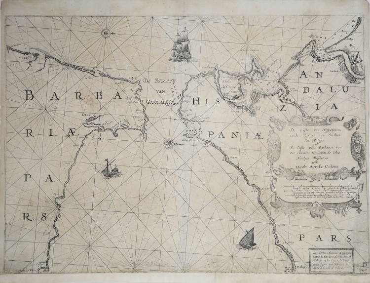 Showing the Strait of Gibraltar, part of Spain, and the North African coast. It features rhumb lines and illustrations of contemporary vessels, typical decorative elements of Dutch nautical charts of the period. Oriented with west at the top, it extends eastward to Malaga and Velez in Africa.