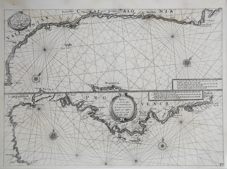 Pascaarte Inhoudende de Zee custen van Valentien ende Catalonia tusschen C. de S. Martin ende Capo Dragonis & Pascaarte van de Zeecusten van Vrankekryck en de Italien aen de midlantsche Zee tusschen capo de Creos ende C. delle Melle.