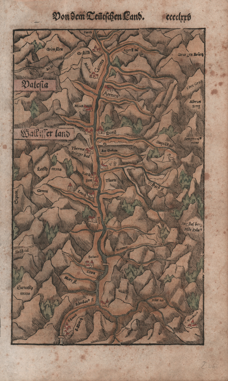 Early woodcut map of the Valais in southern Switzerland. Showing the region at the river Rhone from the Furka Pass to St. Maurice. Plate taken from the Cosmographiae Universalis, German edition, Basel, second half of the 16th Century.