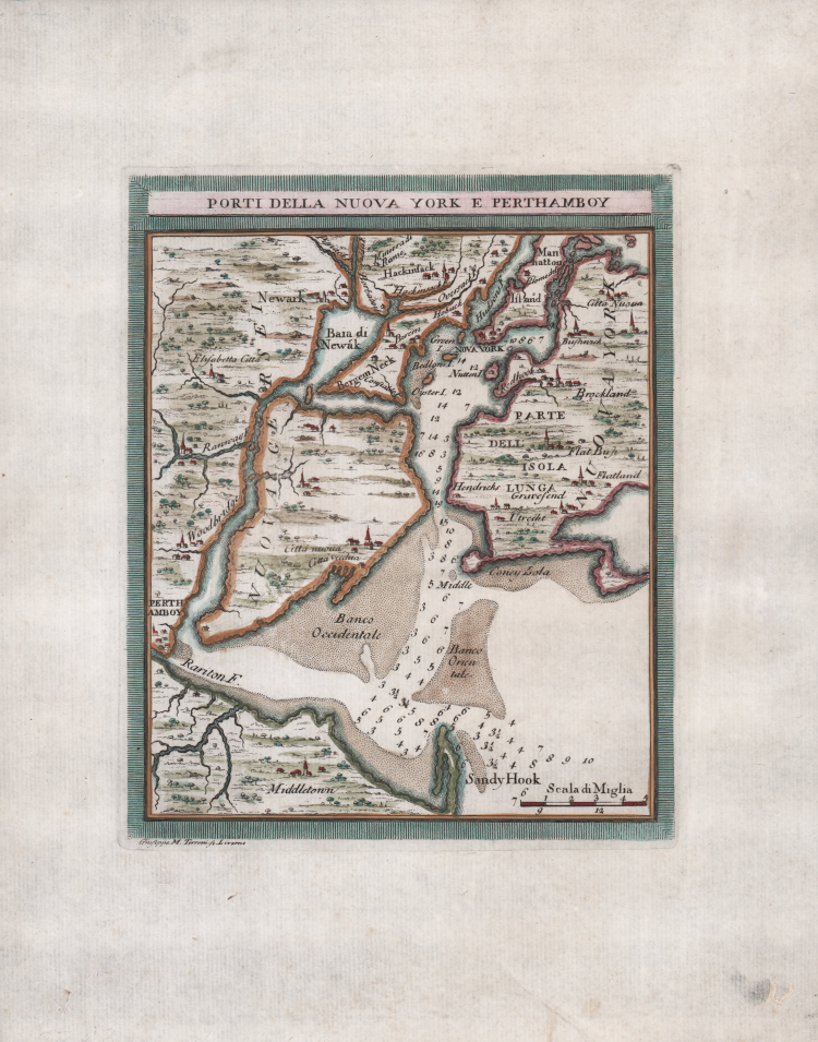 Interesting and detailed map of New York Harbor, published in the Il Gazzettiere Americano, edited in 3 volumes by Marco Coltellini, Livorno, 1763.