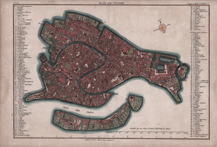 Pianta della città tratta dal “Voyage en Italie contenant l’histoire les anecdotes les plus singulieres de l’Italie, sa description; les usages, le gouvernement, le commerce, la littérature, les arts, l’histoire naturelle, les antiquités ... par m. De La Lande" edito a Parigi nel 1786.