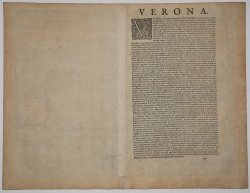 Braun & Hogenberg's views of Verona. The upper view is a nice bird’s eye view of the city, with a key naming five places. In the lower sheet is a classic town plan, with an engraved view of the the Amphitheatre in the lower right corner. Included in the Civitates Orbis Terrarum.