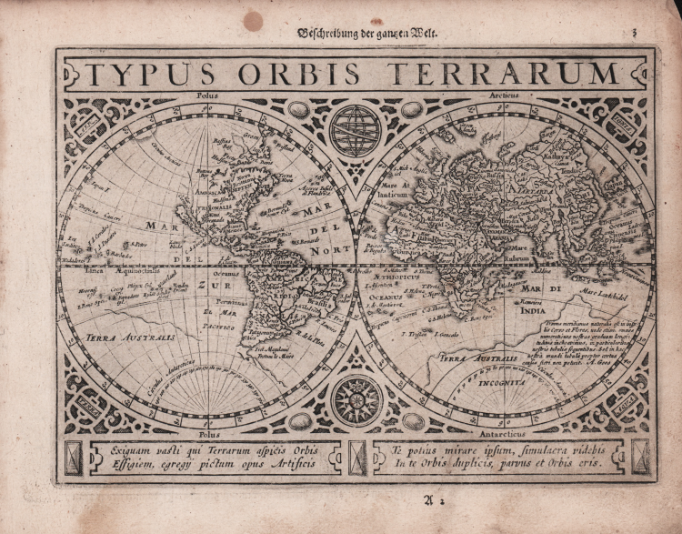 A miniature map taken from Atlas minor, Das ist: Eine kurtze, jedoch gründliche Beschreibung der gantzen Weldt. Engraved by Abraham Goos or Pieter van den Keere, first issued by Johannes Janssonius in 1628.