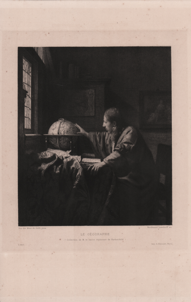 Engraving based on Johannes Vermeer's painting entitled “The Geographer.” The original painting, created between 1668 and 1669, is located at the Städelsches Kunstinstitut in Frankfurt. Published in “L'Art,” volume XXXI, 1882.
