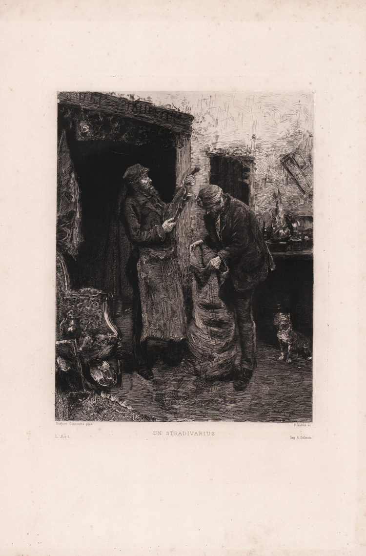 A bearded man standing in a shop and examining a violin, and another man standing before him and holding a large sack; after Goeneutte; published in 'L'Art'. c.1882.