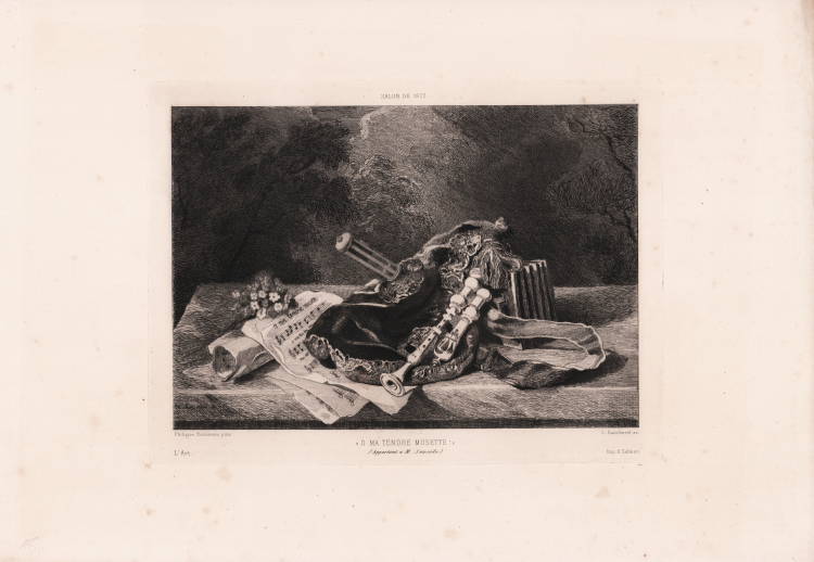 Still-life with bagpipes and music sheet, after Philippe Rousseau; published in 'L'Art', volume X, 1877.