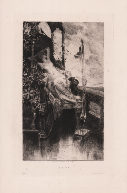 A soft nude of an abandoned woman, crying out for the magic genius Aladin. Le Rêve is a wonderful black and white etching and drypoint on ivory-colored paper by Henri Dumont Courselles (Paris, 1856 - 1918
