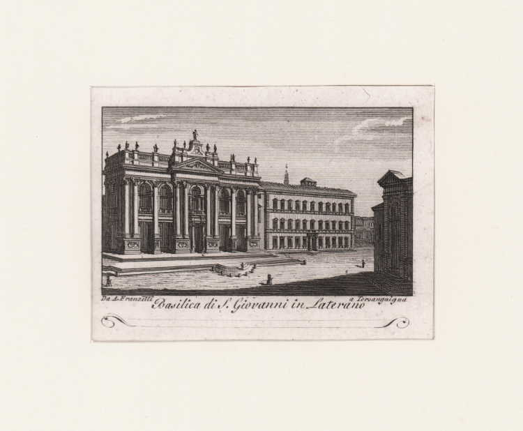 Franzetti, a chalcographer working in Rome with a workshop between Via del Corso and Torsanguigna, is known for his small engravings of views that were often used as business cards. They all contain a line at the bottom where one's name could be written in ink. The small views were often printed four to a sheet.