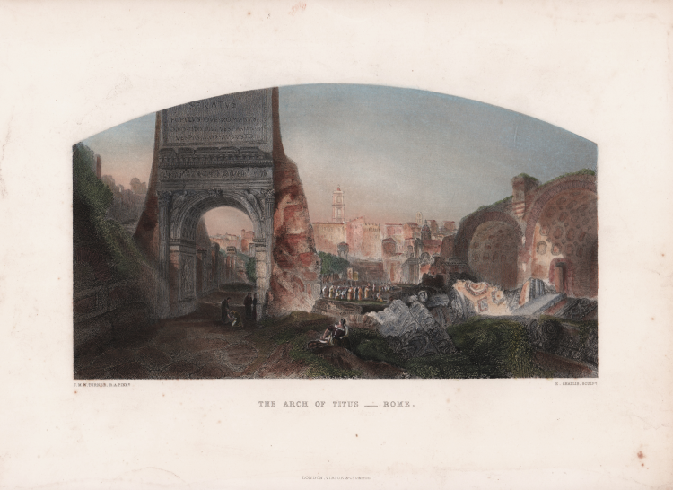 View of Roman Forum, with the arch on the left, three monks standing below, woman kneeling in prayer in front of one, another woman sitting in the centre foreground seen from behind.