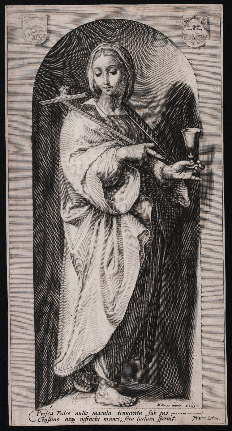 This print is number 1 in the "Le Virtù" series, consisting of seven plates, five of which were engraved by Jacob Matham and two by Jan Saenredam (Zaandam 1565 – Assendelft 1607) based on drawings by Goltzius. At the bottom right, "Goltzius Invent. A 1593", at the left, the numeral I, and below the figure, "Prisca Fides … tartara spernit"/"Franco Estius".