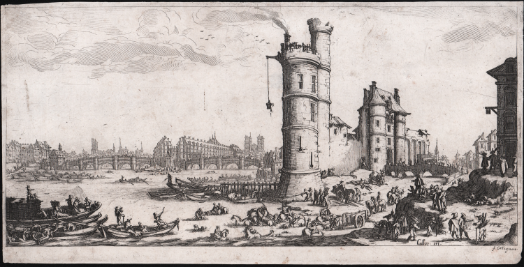 Copy, on the same verso, of Jacques Callot's famous "Tour de Nesle" etched around 1629. The work depicts a view of Paris with the Tour de Nesle, a watchtower that was part of the medieval city walls on the left bank of the Seine. The Tour de Nesle was a fortified and turreted building built around the 13th century. It became famous for the "Tour de Nesle scandal" of 1314, in which the daughters-in-law of King Philip IV of France were accused of adultery. The tower was demolished in 1665, and the Bibliothèque Mazarin now stands in its place.