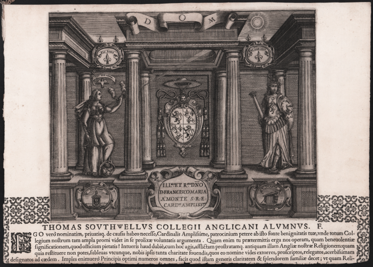 Allegorical print for the thesis defense of Thomas Soutwell (Thomas Bacon) discussed at the English College in Rome around 1613, and dedicated to Cardinal Francesco Maria Bourbon del Monte Santa Maria, whose coat of arms appears in the center of the composition.