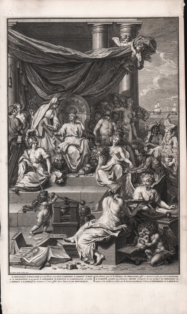 Allegorical plate used as the frontispiece of the Histoire des Provinces-Uniés des Pays Bas ... avec les principales médailles et leur explication, published in Amsterdam by Zacharias Châtelain from 1723 to 1728.