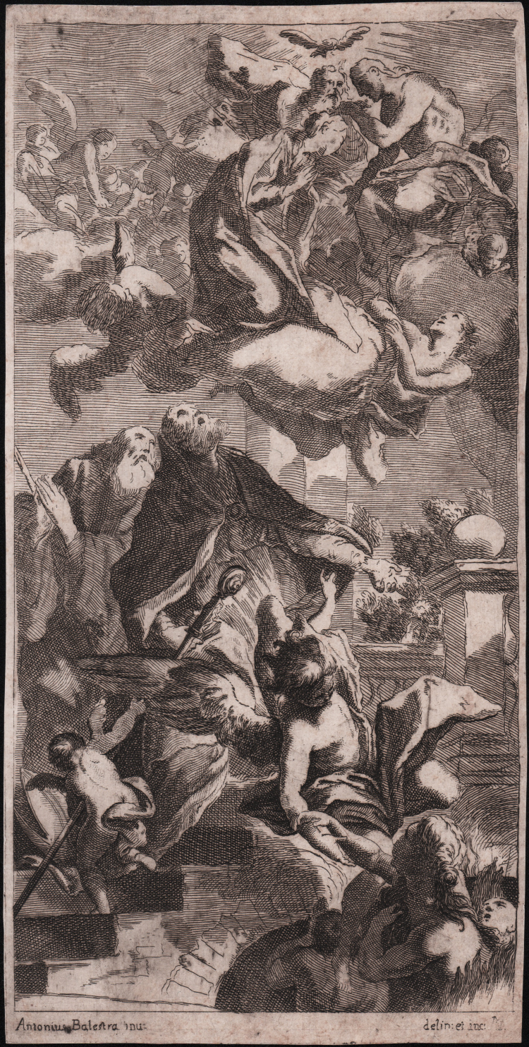 Bellini wrote: “This work was attribuited to Balestra by Ozzola, but non impression of it have been found. Albricci states that she has not examine this etching but notes that Balestra made three paintings with the subject of the Madonna with two Saints, and says that the etching may be after one of these paintings”.