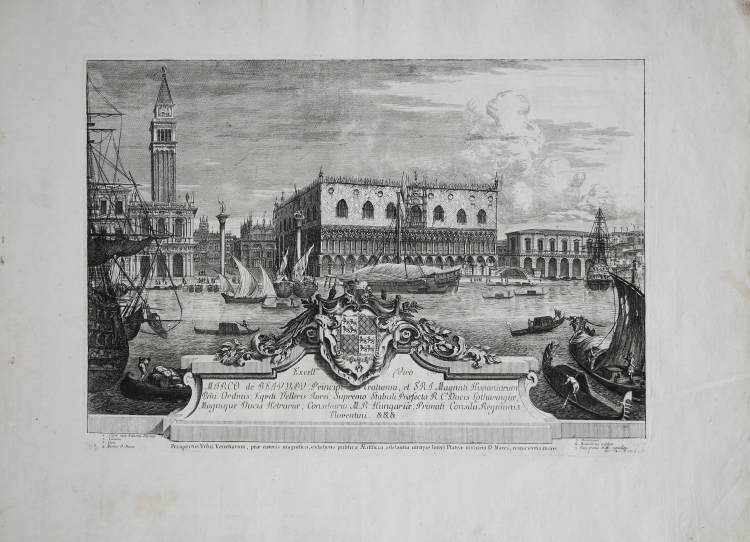 Etching, 1741, lettered with title, and key to seven places in the view. With coat of arms and engraved dedication; in bottom right corner 'Michl. Marieschi delt. et incit.'