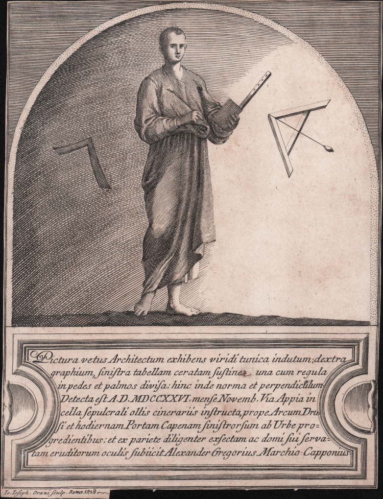 This extremely rare engraving by Giovanni Giuseppe Orazi, from 1728, shows an architect with various measuring instruments. The work, titled "Pictura vetus Architectum exhibens" depicts an architect holding a compass and a wax tablet. At his sides are a set square and a plumb line. The text below describes the discovery of an ancient mural painting in November 1726. The painting was found in a burial chamber on the Appian Way, near the Arch of Drusus and today's Porta Capena. Marquis Alessandro Gregorio Capponi had the painting removed from the wall to keep it in his home.
