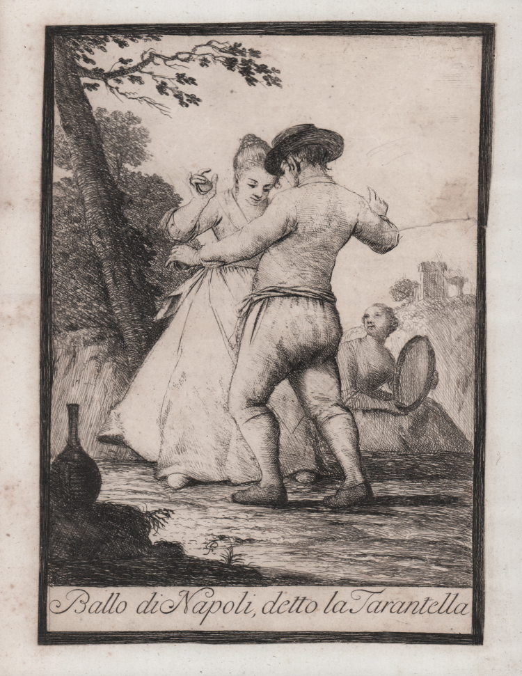 It depicts the famous folk dance of the Tarantella, typical of southern Italy, which has traditionally become characteristic of the Neapolitan people. According to its etymology, it seems to originate from Taranto, or perhaps its name derives from the tarantula, whose bite, according to popular belief, produces a kind of Bacchic frenzy that excites people to dance. The tarantella has been known since the 14th century. It is similar to the saltarello, with which it is confused in certain regions.