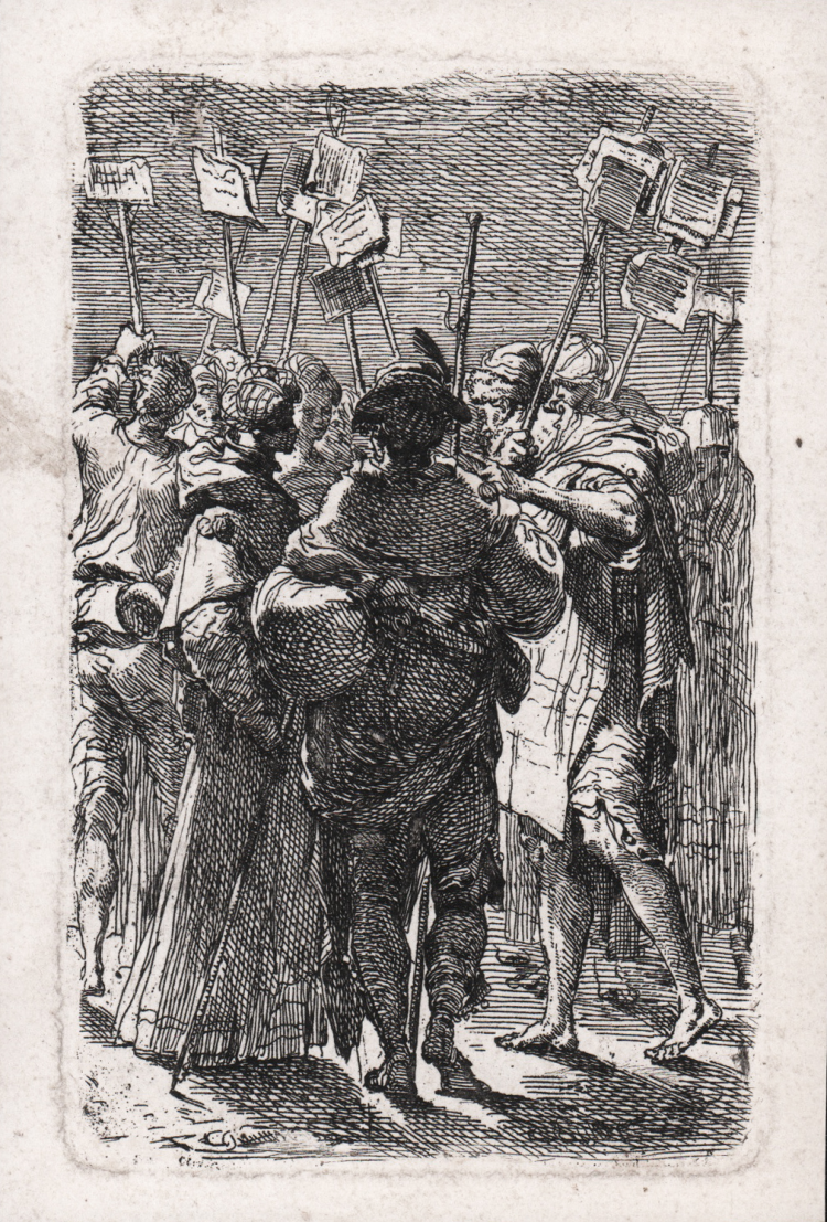 The brushstrokes are very free, and the bite is pronounced to emulate the nocturnal atmosphere; the light comes from the left and casts dark shadows on the ground. The small space is crowded with men, mostly captured from behind, forming a compact mass that occupies three-quarters of the space. Above them is the dark sky and the poles of their banners. In the foreground, exactly in the center, is a man captured from behind, full-length, dividing the space vertically, adding momentum and elegance to the composition. At his side are two men in profile observing him, while in the background are other pilgrims. The strong chiaroscuro contrasts intensify the pathos of the representation.