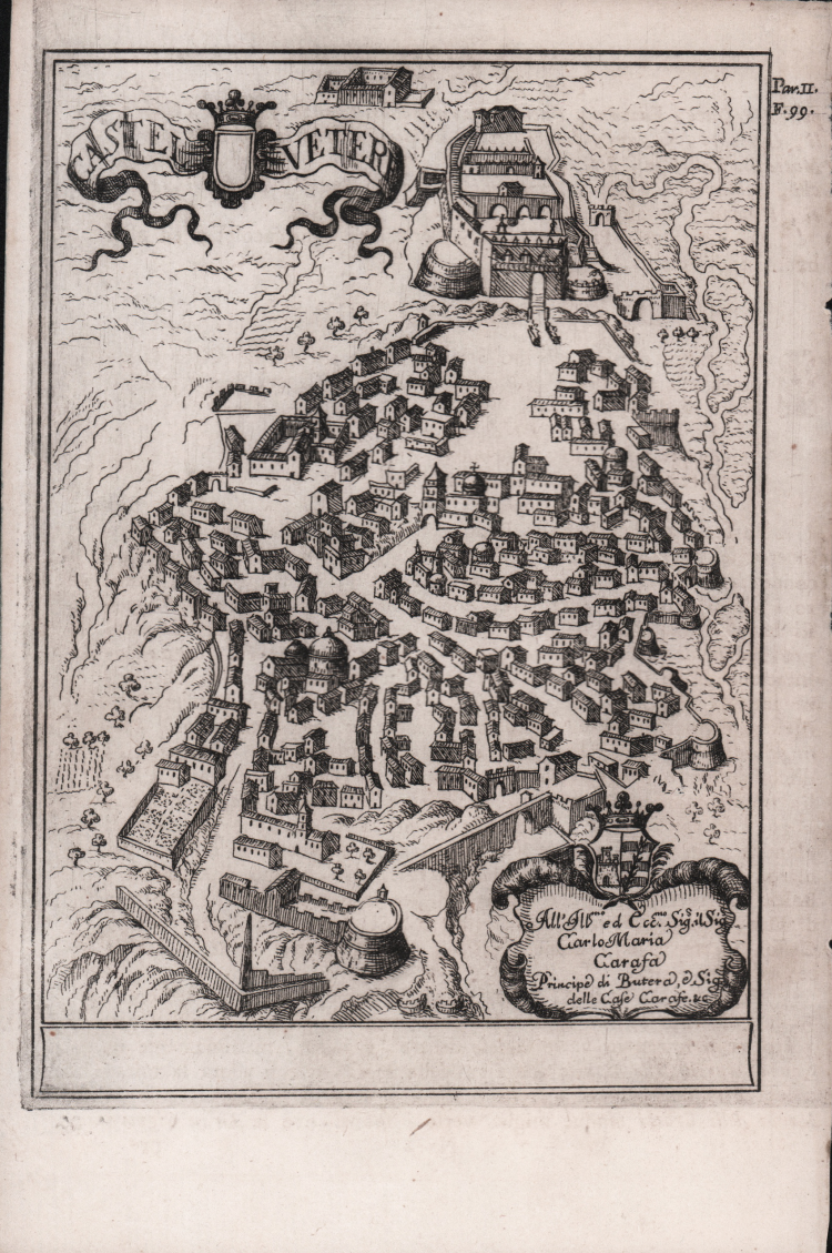 Magnifica veduta prospettica della città disegnata ed incisa da Francesco Cassiano da Silva per la celebre opera dell’abate Pacichelli, Il Regno di Napoli in prospettiva diviso in dodici province, in cui si descrivono la sua metropoli fedelissima città di Napoli e le cose più notabili e curiose, e doni così di natura, come d'arte di essa; e le sue centoquarantotto città [....] con le loro vedute diligentemente scolpite in rame, pubblicato postumo a Napoli nel 1703.