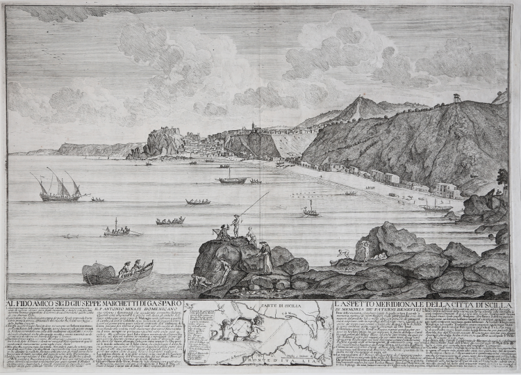 Rarissima veduta di Scilla, disegnata ed incisa da Willem [Guglielmo] Fortuyn, pubblicata nel 1777.