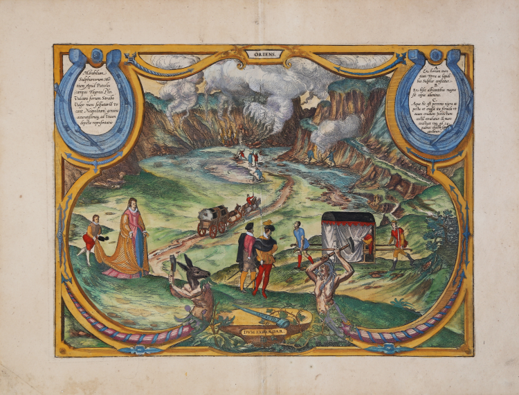 La tavola raffigura le manifestazioni gassose effusive nel cratere della Solfatara a Pozzuoli, la dimora mitologica del dio romano del fuoco, Vulcano. La veduta raffigura la regione della costa napoletana dove mortali vapori sulfurei si levano dal terreno. Le figure allegoriche con una testa d'asino e una testa di Medusa che colpiscono un'incudine con martelli da fabbro, e i testi dei cartigli incorniciati da ferri di cavallo, sono chiari riferimenti alla fucina del dio Vulcano. Al centro vediamo l'artista (Georg Hoefnagel) e lo studioso (Abraham Ortelius) che discutono nei dettagli di ciò che vedono (C: "L'acqua qui è sempre nera, fangosa e così calda che se ci si mette dentro un uovo, ne esce cotto; l'acqua bolle come il mare e spesso raggiunge un'altezza di 24 palmi").