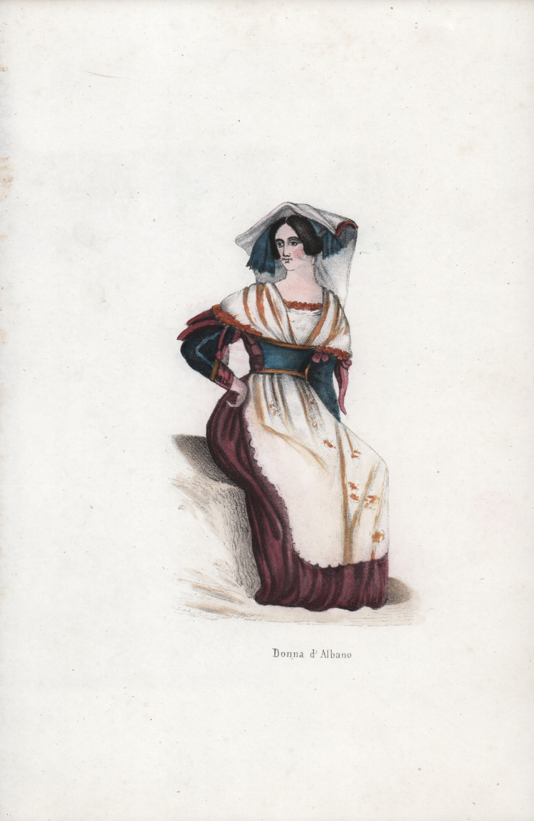 Costume popolare tratto da "Usi e costumi sociali, politici e religiosi di tutti i popoli del mondo da documenti autentici e dai viaggi migliori e piu recenti …" di Nicolas Dally. Stampata a Torino dallo Stabilimento tipografico Fontana, nel 1844.