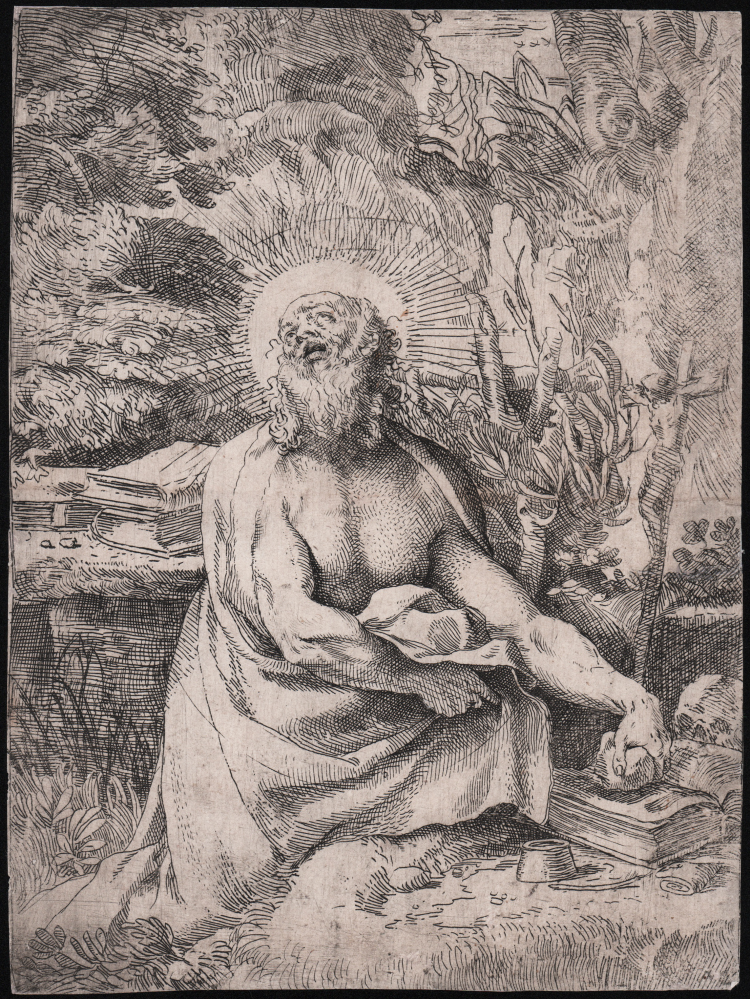 La tecnica di Annibale qui – per lo più acquaforte con qualche ritocco a bulino – si adatta mirabilmente alle esigenze espressive della stampa. I suoi tratti incisi, pesanti, decisi e deliberati e i tratteggi densi e corposi si adattano la sobria imponenza della composizione. Il peso relativamente indifferenziato delle linee incise sia nella figura che nell'ambiente contribuisce a intrecciare San Girolamo nella natura selvaggia di alberi, rocce e fogliame. Il volto e la barba, al contrario, sono definiti da linee più chiare e abbozzate, a suggerire che la loro sostanza materiale sia stata dissolta dalla luce divina che pulsa nell'aureola del santo” cf. Richard Wallace in Italian Etchers of the Reinassance & Barocque, pp. 108-109).