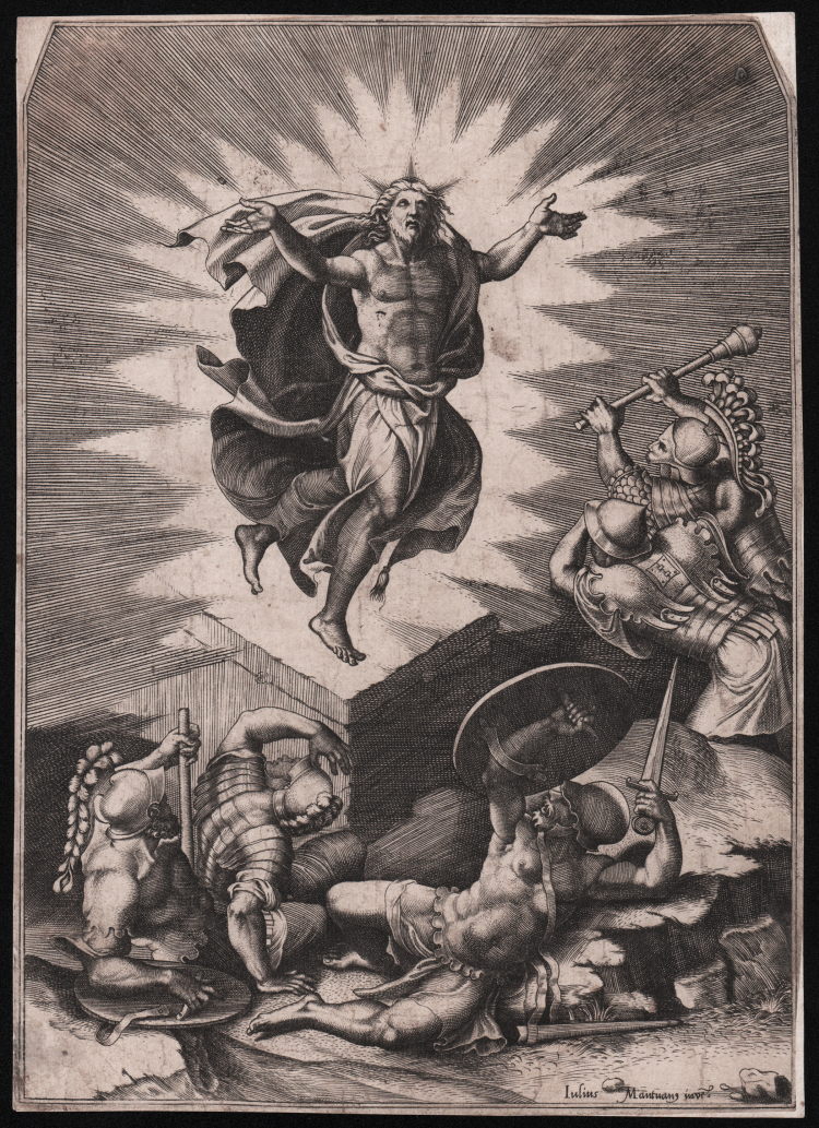 L’incisione, la cui autenticità è messa in dubbio da Mariette e Bellini, viene comunemente ritenuta copia in controparte della Resurrezione di Giovanni Battista Scultori. Tuttavia, come osserva Massari, lo stile grafico e le differenze tra le due incisioni fanno escludere tale derivazione.