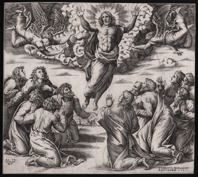 Bulino, 1541, datato in lastra in basso a destra 'TOMASIUS BARLACHIS / 1541', e firmato a sinistra, con il monogramma NB.F, sotto l’iscrizione 'RA.VR. / INVENT.
