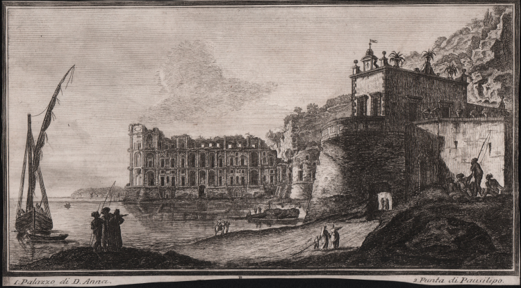 Veduta tratta dal celebre Raccolta delle più interessanti vedute della città di Napoli e luoghi circonvicini. Disegnate da Giuseppe Bracci ed incise in N. XXX rami da Antonio Cardoni pubblicato da Gervasi, Napoli, 1774.