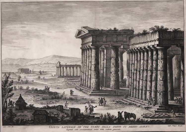 L'artista e incisore Filippo Morghen e il pittore Antonio Joli lavorarono entrambi a Napoli, all'epoca sotto il governo illuminato dei re Borbone Carlo II e Ferdinando VII. Morghen realizzò stampe per i volumi pubblicati sulle antichità di Ercolano e riportò le immagini di Paestum realizzate da Joli negli anni Sessanta del Settecento in un piccolo portfolio di stampe. Questo era dedicato a Frederick Calvert, VI Barone di Baltimora, un personaggio poco raccomandabile che si diceva avesse un harem a Istanbul e che non nutrisse alcun interesse per il Maryland se non per goderne le rendite. In linea con il suo intento didattico, la pubblicazione Joli-Morghen includeva una lunga spiegazione delle immagini.