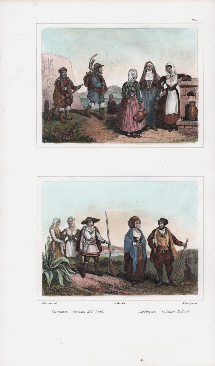 Coppia di scene di costume popolare tratta dal celebre L'Italie, la Sicile, les Iles Éoliennes, l'Ile d'Elbe, la Sardaigne, Malte, l'Ile de Calypso etc. D'après les inspirations, les recherches et les travaux de M. M. le Vicomte de Chateaubriand, De Lamartine, Raoul-Rochette, le Comte de Forbin, Piranesi, Mazzara, et de Napoléon, Denon, Saint-Non, Lord Byron, Goethe, Visconti, Cicognara, Lanzi, de Bonstetten, Swinburne, etc. Sites, Monumens, Scènes et Costumes, d'après M.me Haudebourt-Lescot, MM. Horace-Vernet, Granet, Isabey, Ciceri, Mazzara, le Major Light, le Cap. Batty, Cooke, Gell et Gandy, Pinelli, Ferrari, Zucoli, et beaucoup d'autres artistes italiens. Recueillis et publiés par Audot Père, Membre de la Société de Géographie, edito a Parigi tra il 1834 ed il 1837 e ristampato a Torino [Giuseppe Pomba e Ca, 1834-1838].