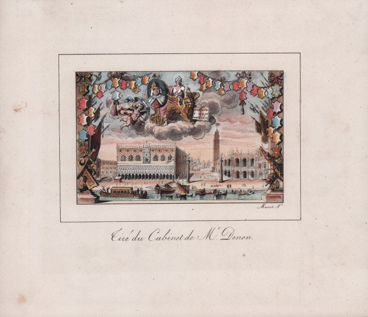 Veduta allegorica di Venezia con il Palazzo Ducale e il Campanile di San Marco, sovrastati da una rappresentazione della Repubblica di Venezia come la Giustizia seduta sul Leone di San Marco tra le nuvole.