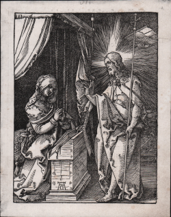 Come sottolinea Strauss, è la prima delle "quattro apparizioni" di Cristo alla madre; definita anche come la controparte de "L'Annunciazione" della stessa serie e opera complementare de "Il congedo di Cristo dalla madre", sempre della La Piccola Passione su legno. In questo caso, un inginocchiatoio separa i due. Entrambi i soggetti sono più propriamente eventi della Vita della Vergine che della Passione. Il gesto di benedizione di Cristo con la mano destra alzata sembra allo stesso tempo sollevare il velo del suo dolore. La composizione assomiglia per molti aspetti a quella di Schäufelein nello Speculum Passionis del 1507. La matrice lignea originale si trova al British Museum di Londra