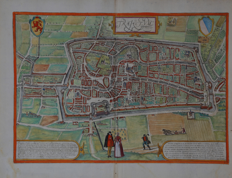 Veduta a volo d'uccello della città olandese di Utrecht, pubblicata nel primo volume (1572) del Civitates Orbis Terrarum, il primo atlante devoto esclusivamente alle piante e vedute delle principali città del mondo. Stampato in sei volumi tra il 1572 ed il 1617 ebbe grande fortuna e diffusione, tanto che ne furono stampate diverse edizioni tradotte in latino, tedesco e francese.
