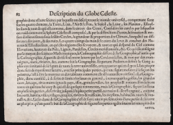 Rara mappa celeste minuscola presenta i cieli boreali e australi con rappresentazioni mitologiche delle costellazioni basate su Tolomeo, inserite in uno sfondo a traforo. Testo in francese sul verso.