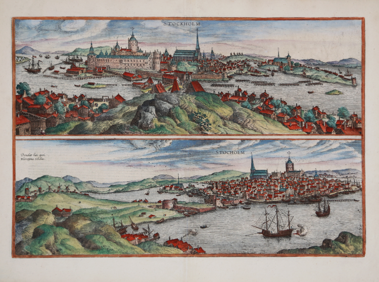 Due vedute prospettiche della città di Stoccolma, pubblicate nel quarto volume del Civitates Orbis Terrarum, edito nel 1588.