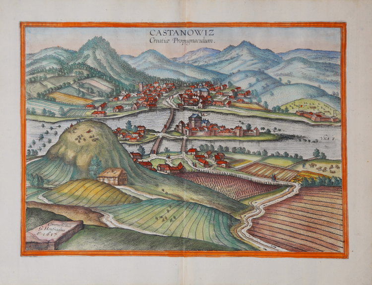Veduta a volo d'uccello della città di Kostajnica (it. Costainizza), in Croazia, pubblicata nel sesto volume (1617) L’opera è del Civitates Orbis Terrarum, il primo atlante devoto esclusivamente alle piante e vedute delle principali città del mondo. Stampato in sei volumi a Colonia, tra il 1572 ed il 1617, ebbe grande fortuna e diffusione, tanto che ne furono stampate diverse edizioni tradotte in latino, tedesco e francese.