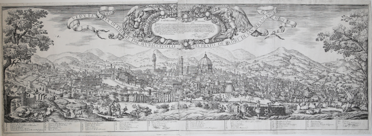 In alto al centro, in un nastro, il titolo: VEDUTA DELLA CITTÀ DI FIRENZE DAL MURICCIUOLO DEL PRATO DÈ PADRI DI SAN FRANCESCO AL MONTE. Nel cartiglio sorretto da angeli ed ornato con tralci di fogliame e simboli della guerra, troviamo la dedica: AL SER:mo P[RI]N[CI]PE LEOPOLDO DI TOSCANA Seren: P[ri]n[ci]pe AVENDO io p[er] proprio diletto intrapreso à delineare la presente veduta della Città di Firenze, nella quale più che in ogni altra, a mio credere si scuoprono minutamente non meno i più riguardevoli edifizzi della stessa Città, che un grandissimo numero delle Ville, che le stanno sparse dintorno, mi son risoluto a stamparla sotto l’eccelso nome di V. A. Di qui mi fò animo a sperare, che q[ue].a mia debol fatica esposta à raggi della sua generosa beneficenza sia p[er] ricevere il suo vero lume, il q[ua]le rompendo le troppo spesse ombre, che v’appariscono della mia ignoranza sia per renderla men difettosa agli occhi di chiunque è per riguardarla. Supplico pertanto la V. A. ad aggradire quest’atto del mio umilissimo ossequio, e a farmi godere gli effetti della sua gran protezione, sotto la quale resto Di V. A. Serenissima Umilissimo Servitore Valerio Spada. Lungo il bordo inferiore una legenda alfanumerica, disposta su dieci colonne, di quarantaquattro rimandi (A-Z), (1-21) a luoghi e monumenti notabili.
