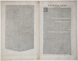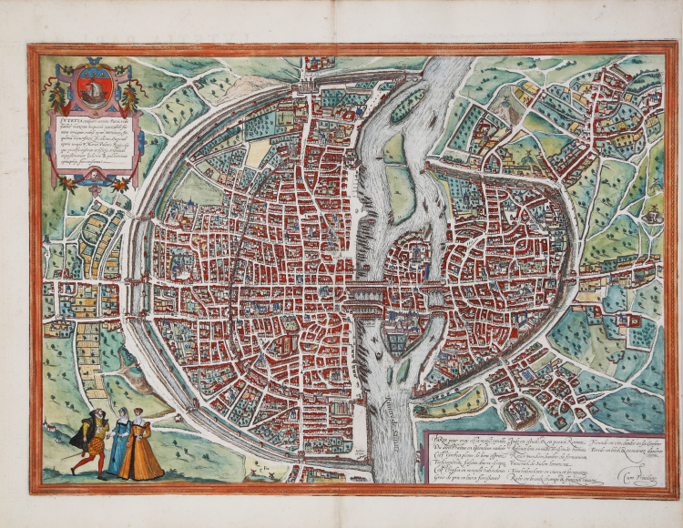 Magnifico esemplare della mappa e veduta di Parigi, pubblicata nel primo volume di Braun e Hogenberg del 1572. Con la Senna che scorre al centro intorno all'Île de la Cité, questa veduta guarda Parigi da nord-ovest, con la parte superiore della mappa orientata a sud-est. La città è presentata da una prospettiva a volo d'uccello equidistante, in cui tutte le strutture sono rese in forma di vista, ma da un'altezza e un'angolazione uniformi rispetto a tutti i singoli punti. Campi fertili circondano la città e i fiumi pullulano di barche, suggerendo ricchezza e prosperità. Nell'angolo in basso a sinistra, un uomo saluta due donne, tutte vestite secondo i canoni della moda spagnola del 1560-1570. Ititolo della mappa, "Lutetia", si riferisce al nome romano di Parigi che, nel XVI secolo, era stato in gran parte abbandonato, ma che continuava a comparire nei riferimenti accademici.